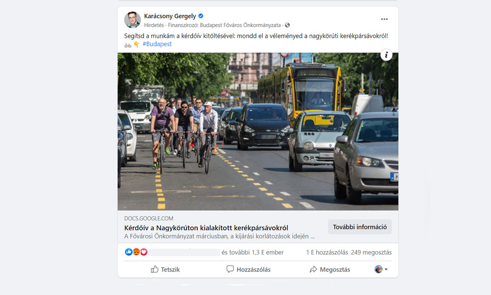 „Segítsd a munkám a kérdőív kitöltésével: mondd el a véleményed a nagykörúti kerékpársávokról!” – kéri fizetett Facebook hirdetésben a főpolgármester. Karácsony Gergely fizetett posztjában az áll, hogy a hirdetést a Fővárosi Önkormányzat finanszírozza.