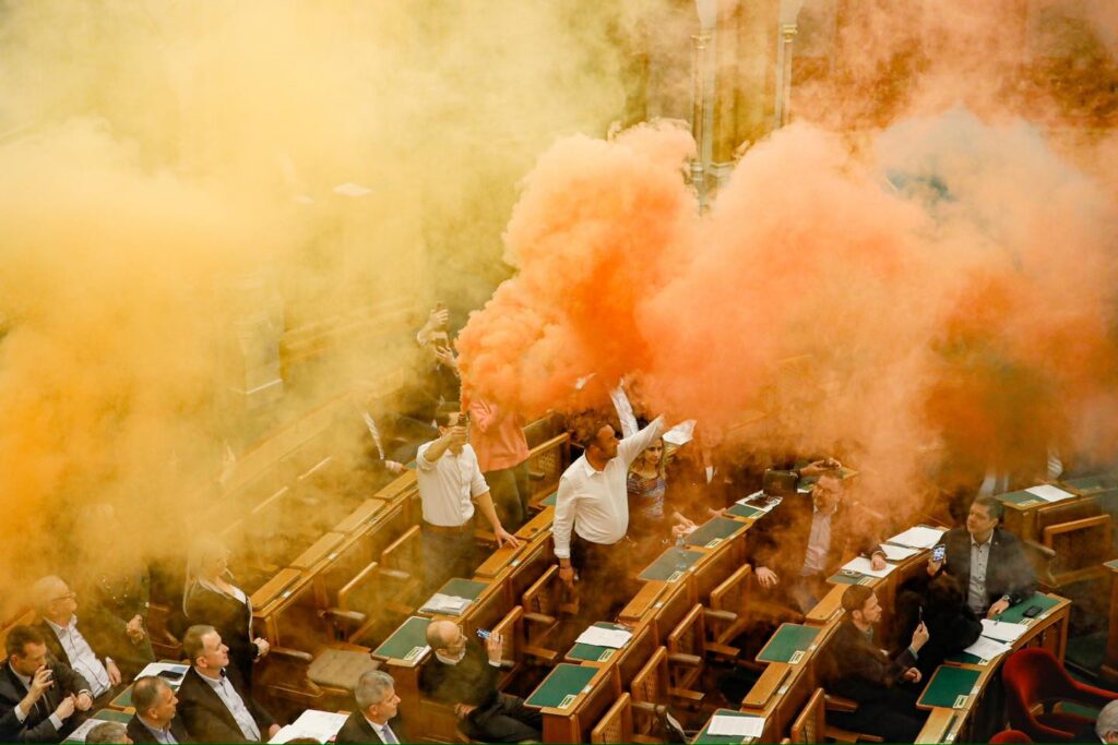 Kiemelt kép: füstbombák az Országgyűlés ülésén – Forrás: Momentum Mozgalom