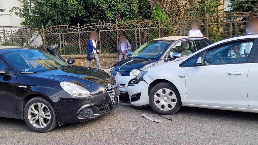 Rosszabb esetben az 5-ös busz, jobb esetben, mint ezúttal, egy Fiat 500-as. A Fiatot vezető fiatalembernek nem volt ideje fékezni, az Opel bal elejébe csapódott, eközben az ütközés hatására az 500-as hátulja megemelkedett és a járdára sodródott, ahol pár másodperccel korábban épp egy kerékpáros haladt.