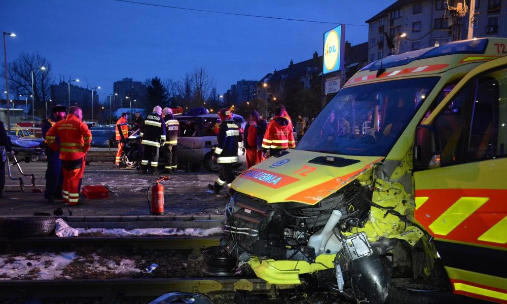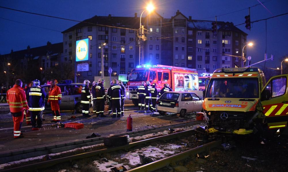 Az ütközés következtében az összetört mentőautó a villamossínekre került. Az autóban ülő két ember beszorult a járműbe.