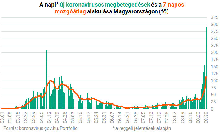292 újabb magyar állampolgárnál mutatták ki az új koronavírus-fertőzést (COVID-19), ezzel 5961 főre nőtt a hazánkban beazonosított fertőzöttek száma. Az adatok alapján soha nem volt még ilyen magas az országban a napi esetszám.