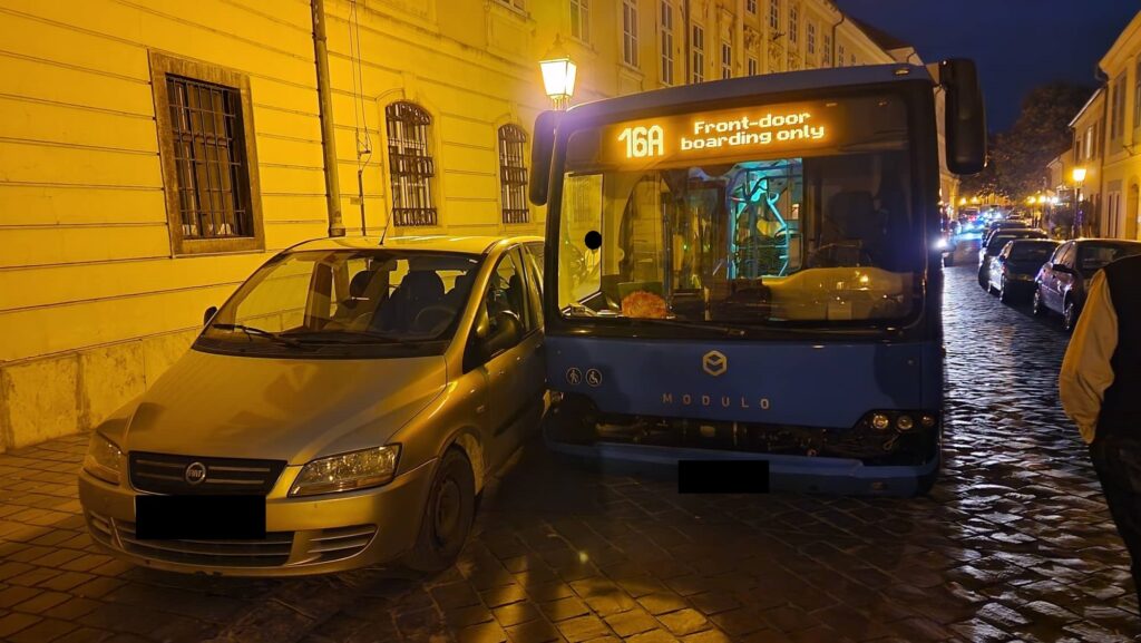 Menetrend szerint közlekedő BKV-busszal ütközött össze egy személyautó Budapest 13. kerületében, Angyalföldön, a Jász utca és Gyöngyösi utca kereszteződésében.