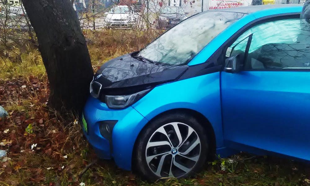 Fának hajtott egy elektromos BMW szerdán délelőtt Dunaharasztiban, a Jedlik Ányos úton.