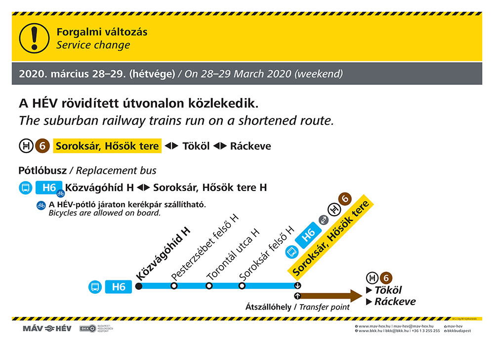 A BKK szerkesztőségünkbe eljuttatott közleménye szerint március 28-án és 29-én, szombaton és vasárnap a H6-os HÉV karbantartási munkái miatt a vonatok rövidített útvonalon, Soroksár, Hősök tere és Tököl, illetve Soroksár, Hősök tere és Ráckeve között közlekednek, ideiglenes menetrend szerint, amely elérhető a BKK honlapján.