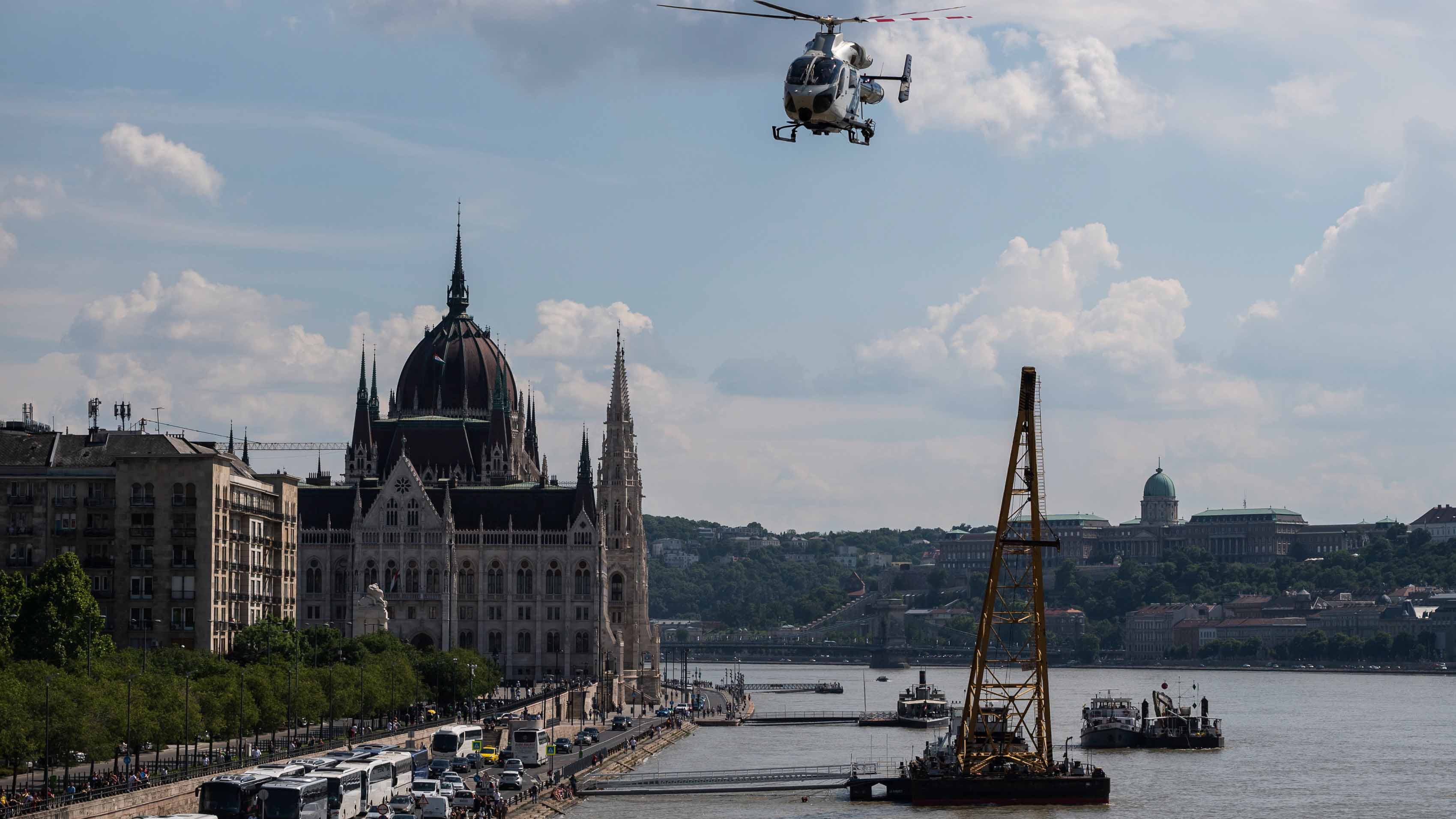 Rendőrségi helikopter a kutatási terület felett a hajóbalesetben elsüllyedt Hableány turistahajó közelében a Margit hídnál, MTI/Mónus Márton