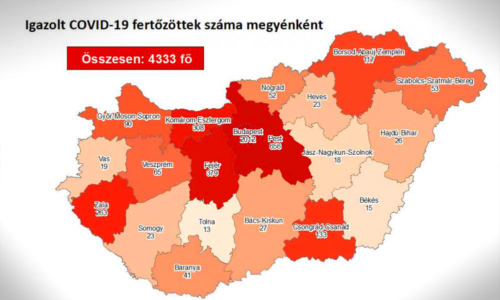 Tizennyolccal, 4333-ra emelkedett az azonosított koronavírus-fertőzöttek száma Magyarországon, újabb elhunyt nincs. Eddig Budapesten 2012, Pest megyében pedig 656 regisztrált fertőzött van. Továbbra is viselni kell a maszkot az üzletekben és a tömegközlekedésben, és továbbra sem tartható 500 fő feletti zenés, táncos rendezvény.
