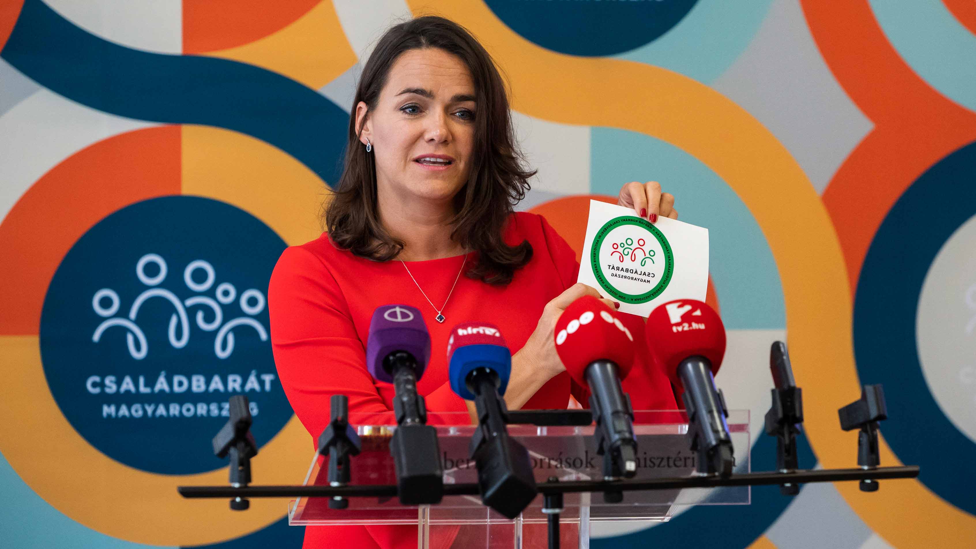 Novák Katalin család- és ifjúságügyért felelős államtitkár bemutatja a nagycsaládosoknak szóló autóvásárlási támogatáshoz tartozó Családbarát Magyarország feliratú matricát az Emberi Erőforrások Minisztériumában – MTI/Mónus Márton