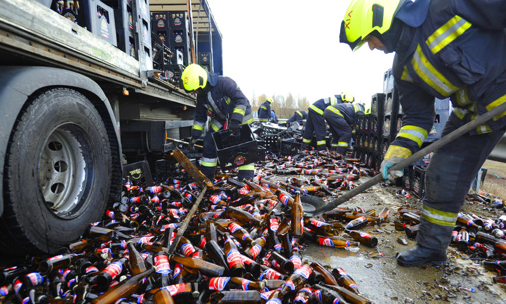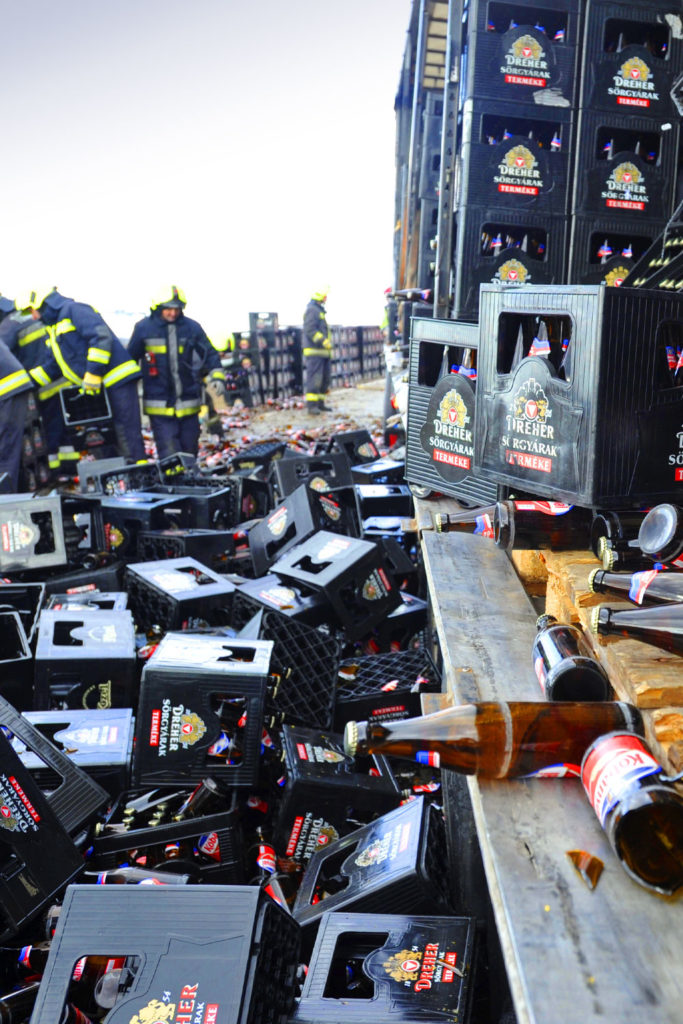 A balesetben szerencsére senki sem sérült meg, de fennakadás volt a környéken. A több tonna sört a katasztrófavédelem munkatársai takarították össze, majd elszállították a megsérült járművet.