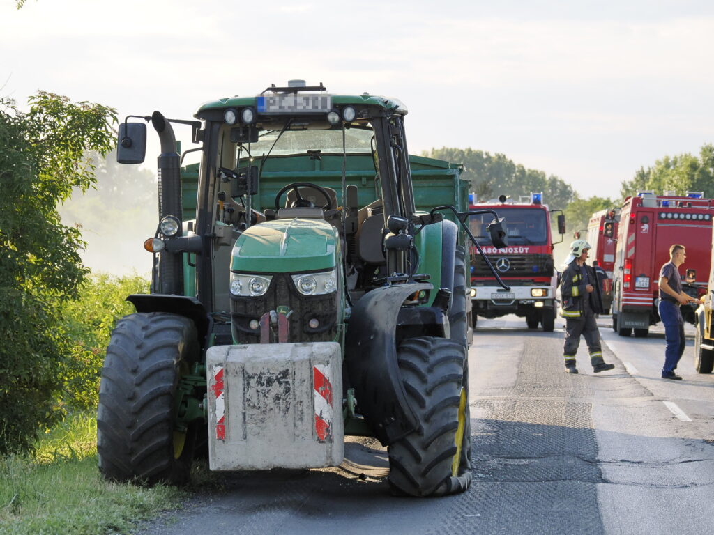 Solt, 2022. július 4. Sérült traktor az 53-as fõúton Solt közelében, ahol összeütközött két kamion és egy traktor 2022. július 4-én. A balesetben hárman meghaltak. MTI/Donka Ferenc
